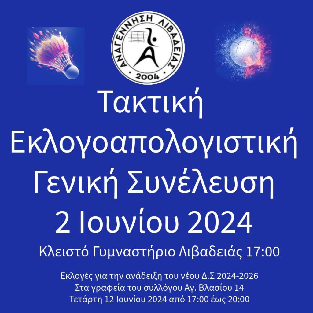 Σήμερα Κυριακή 2 Ιουνίου 2024 και ώρα 17:00 και σε περίπτωση μη απαρτίας ώρα 18:00 συμμετέχουμε στην Ετήσια Γενική Συνέλευση του συλλόγου στο κλειστό Γυμναστήριο Λιβαδειάς.