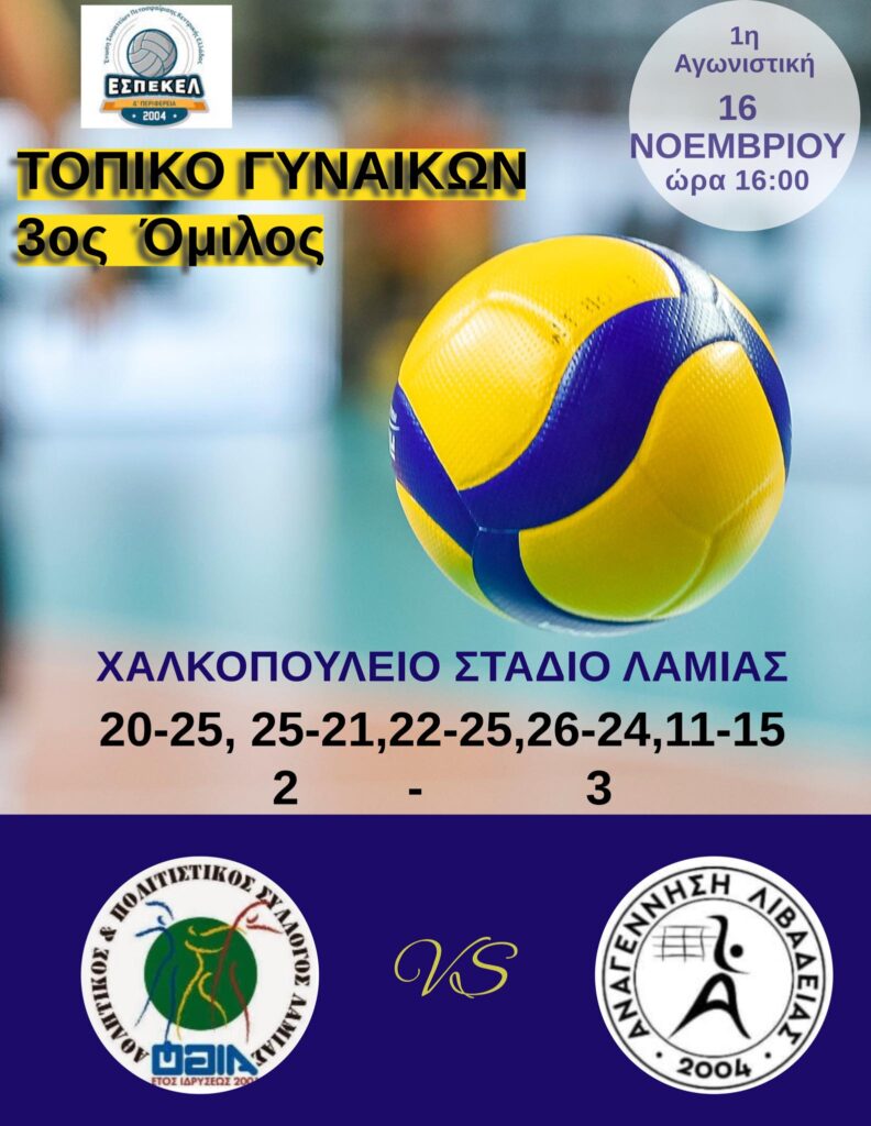 Μεγάλη εκτός έδρας νίκη για την γυναικεία ομάδα στο Χαλκοπούλειο Στάδιο επι της Φθία Λαμίας με 2-3 σετ (20-25, 25-21,22-25,26-24,11-15) στα πλαίσια της 1ης αγωνιστικής του τοπικού Γυναικών στο 3 όμιλο. You Might Also Like Μία νίκη και δύο ήττες το Σ/Κ 17-18/2 για τις ομάδες volley. 18 February 2024 1η θέση και η Νεανίδες 3 December 2023 Με το δεξί και οι κορασίδες το 2026! 11 January 2026